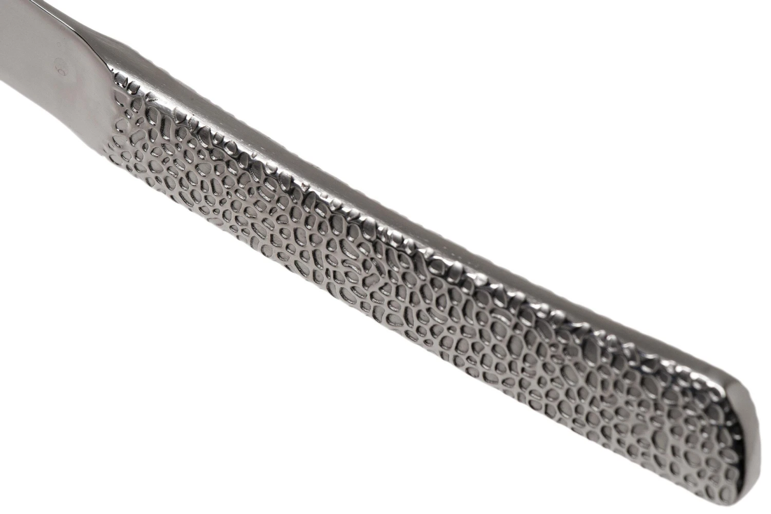 Ces trois couteaux à steak Amefa Bongo sont très agréables en main, grâce à leur manche extra large. La lame est micro-dentelée. On coupe sans effort un délicieux morceau de viande sans la déchirer. En plus, ces couteaux arborent un superbe motif “martelée” au niveau du manche.
