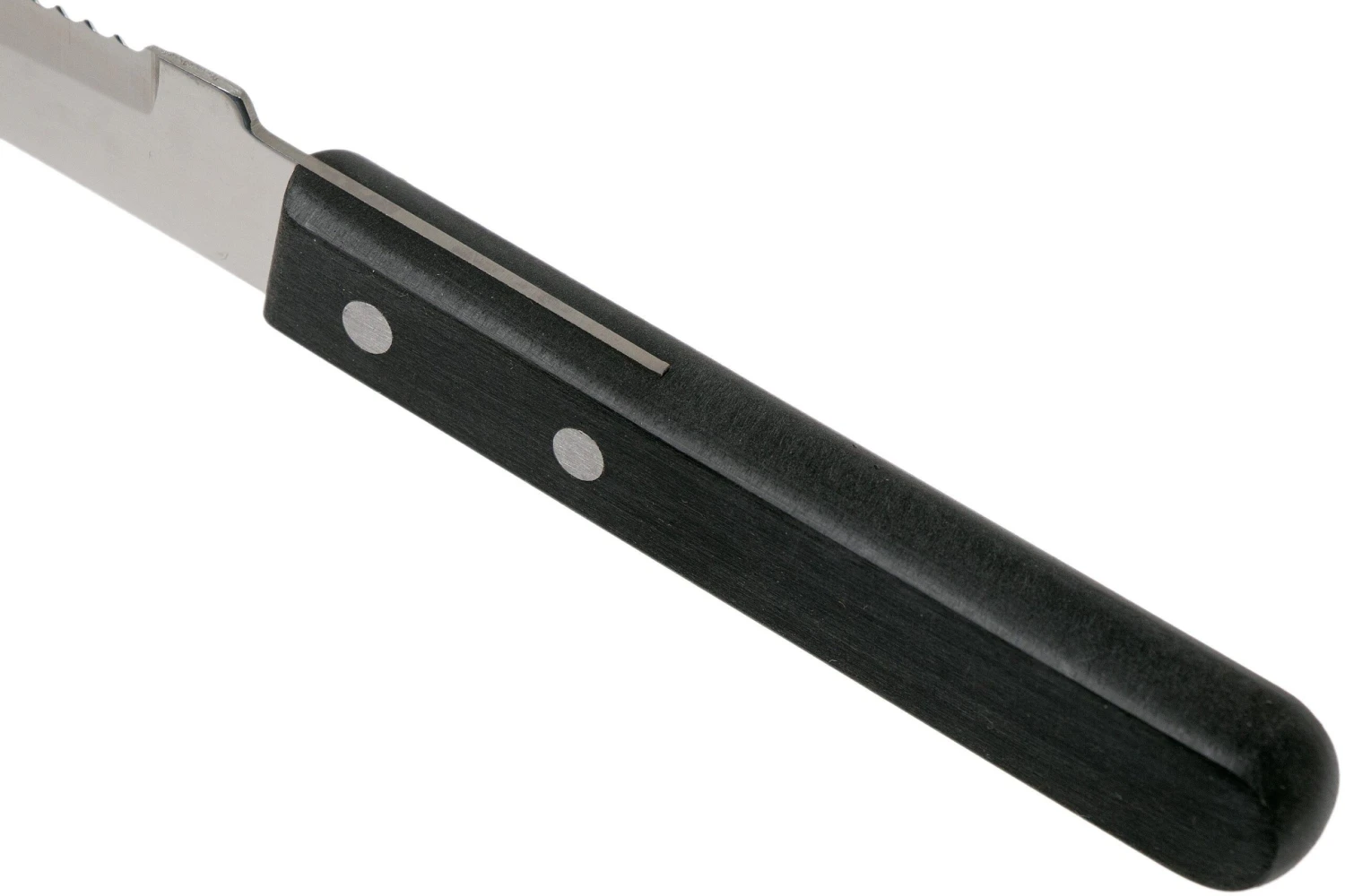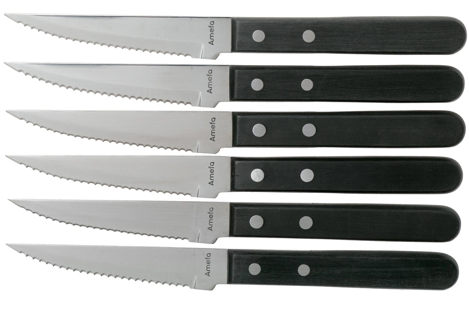 Dégustez les meilleurs steaks et pizzas, avec les couteaux à steak Amefa ! Ces 6 couteaux à steak arborent un manche noir, pour un look brut et robuste. Ces couteaux sont parfaits pour couper des steaks, pizzas et viandes grillées. C’est grâce à leur lame dentelée très tranchante. Cela permet de trancher proprement plutôt que de déchirer la viande. Les dents sont également adaptées pour couper la croute croustillante d’une pizza ou d’un pain. Ils gardent plus longtemps leur tranchant que des couteaux lisses.