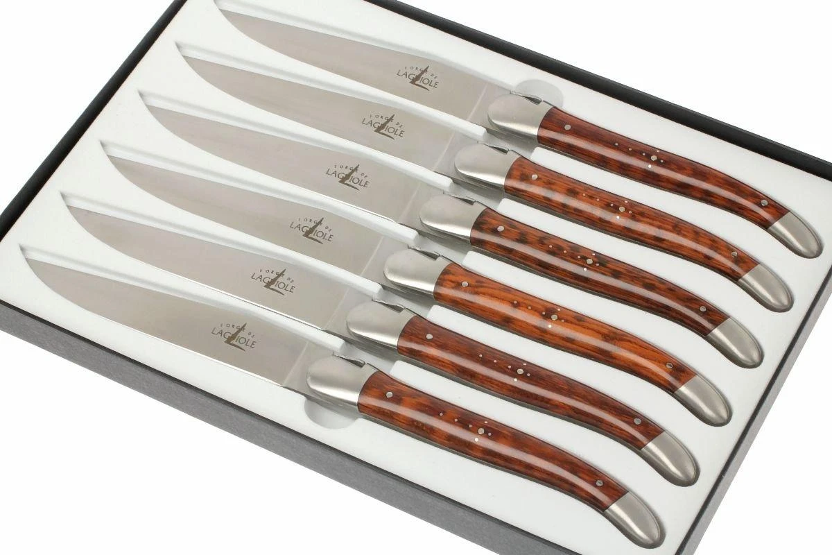 Ce set de couteaux à steak Forge de Laguiole est composé de six magnifique couteaux fabriqués à la main. Les couteaux ont une lame en acier inoxydable très tranchante et qui conserve très bien son tranchant. Les manches en bois d’amourette sont très luxueux et sont ornés de la fameuse croix du berger formée avec les sept rivets. L’abeille si caractéristique de Laguiole ne manque pas à l’appel.