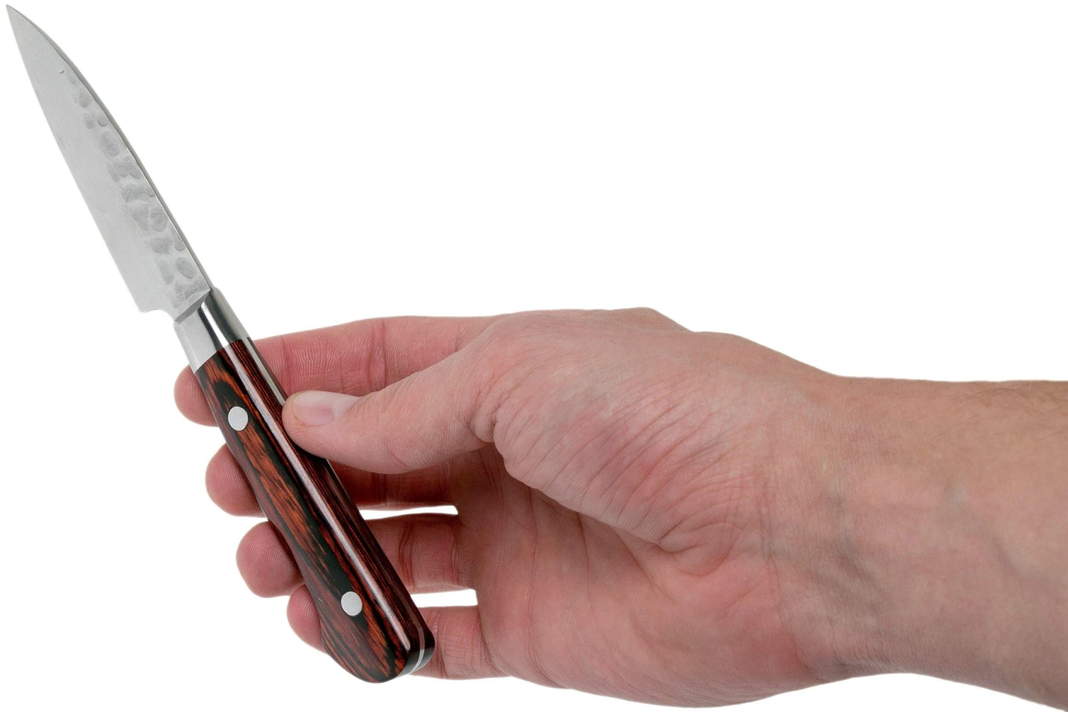 Ce couteau Sakai Takayuki petty de la gamme 33-Layer Damascus a une lame de 8 cm comparable Ă une lame occidentale. Il est parfait pout les travaux de coupe et d’Ă©pluchage prĂ©cis.