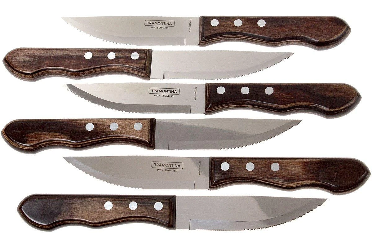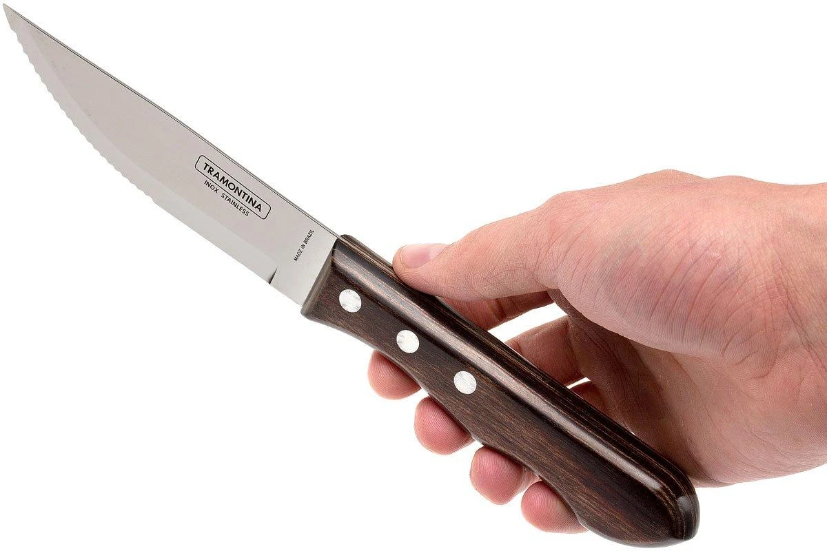 Les couteaux à steak Tramontina ne font qu’une bouchée de la viande grillée. La lame est en acier inoxydable et le manche est en bois. Des rivets en inox maintiennent le tout en place. Le bois est traité et, selon les directives du fabricant, peut être lavé au lave-vaisselle. Nous recommandons cependant de les laver à la main.