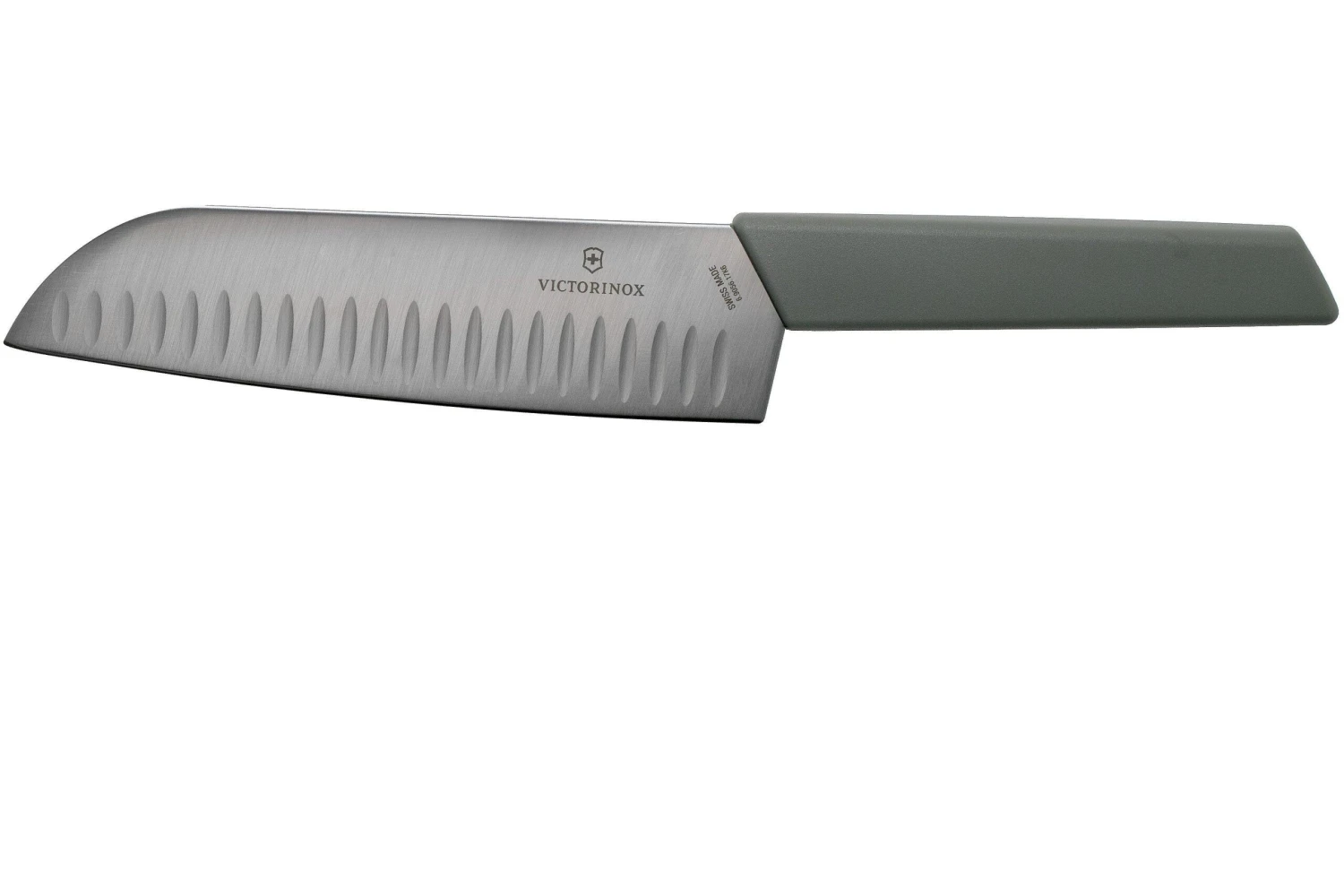 Le couteau santoku Victorinox Swiss Modern est Ă l’origine un couteau de chef japonais. On utilise ce type de couteau au Japon essentiellement pour prĂ©parer les Sushis. On remarque les alvĂ©oles sur la lame. Elles permettent d’éviter aux aliments d’y coller. Ce dĂ©tail est particulièrement pratique lorsque l’on coupe des tranches. Ce couteau est indispensable dans toute bonne cuisine.