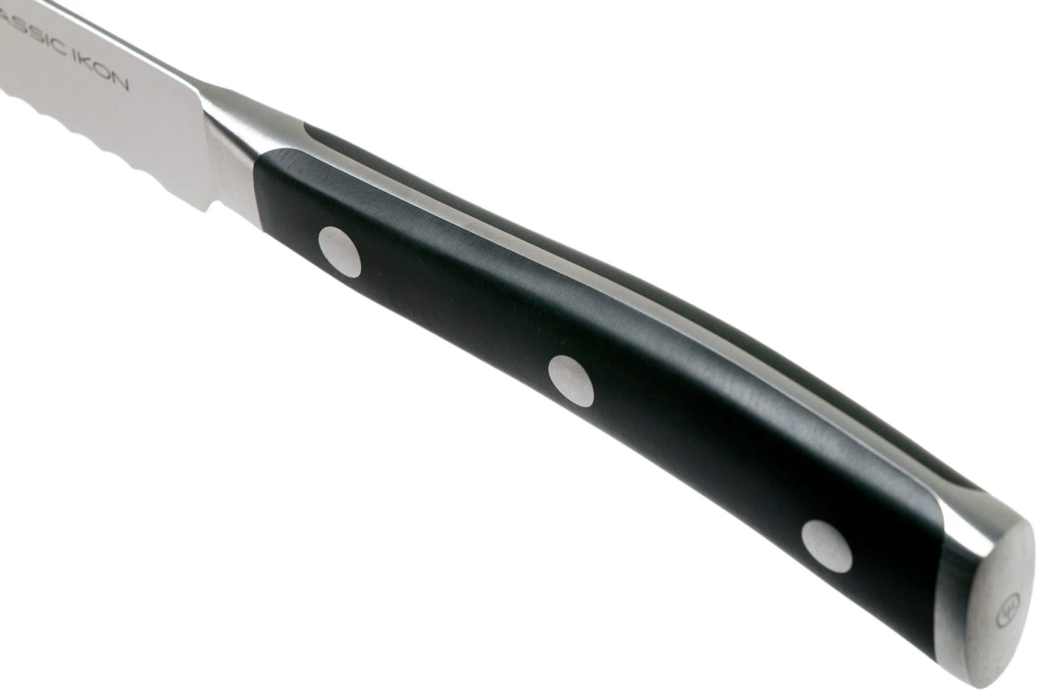 Le couteau à tomates Wüsthof Classic Ikon 14 cm est, comme son nom l’indique, un couteau parfait pour trancher les tomates. Sa lame dentelée permet de traverser la peau d’une tomate sans l’écraser. Après avoir coupé les fruits et légumes l’extrémité pointue de la lame permet de les piquer pour les déplacer.